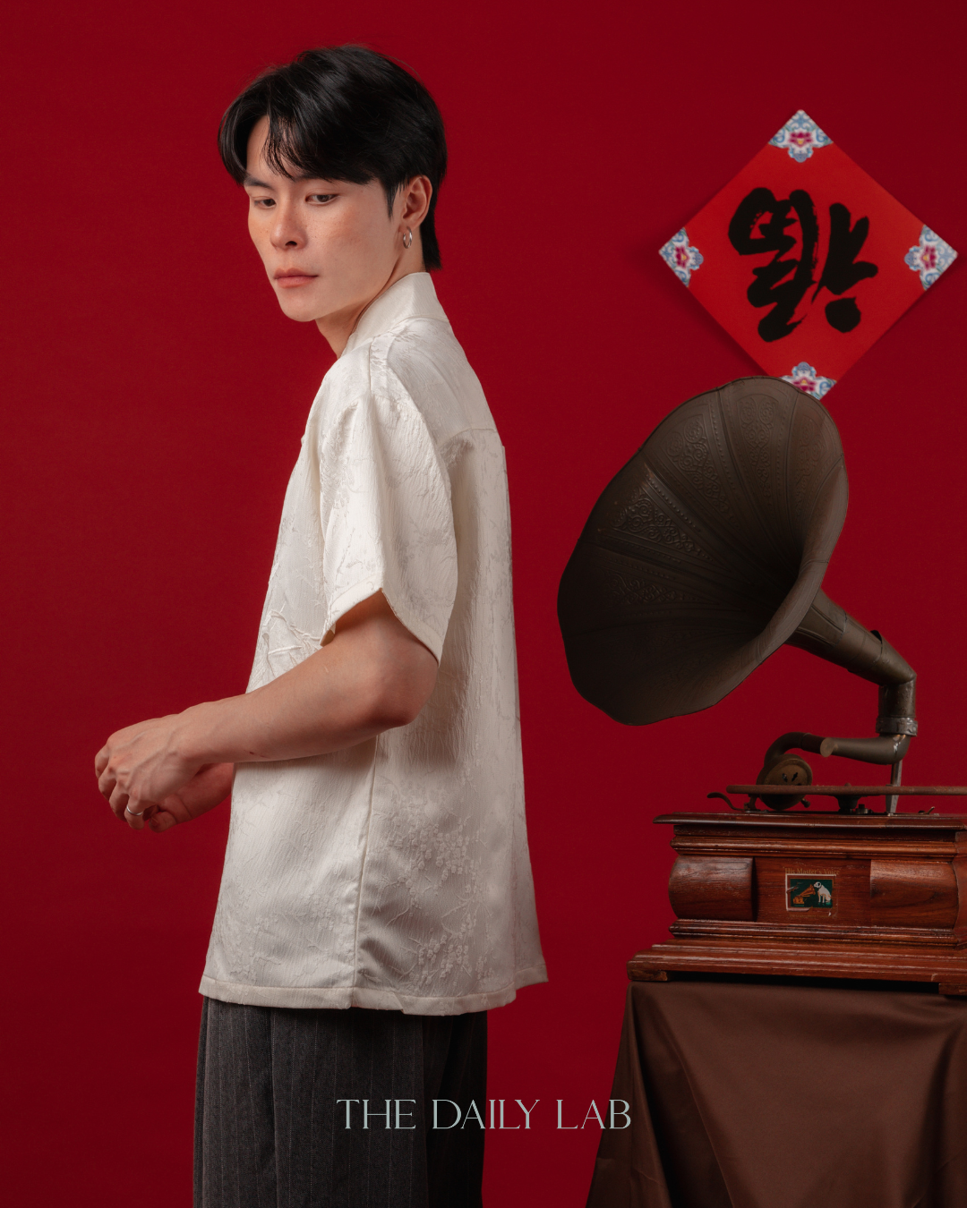 - Classic Mandarin collar with traditional knot buttons