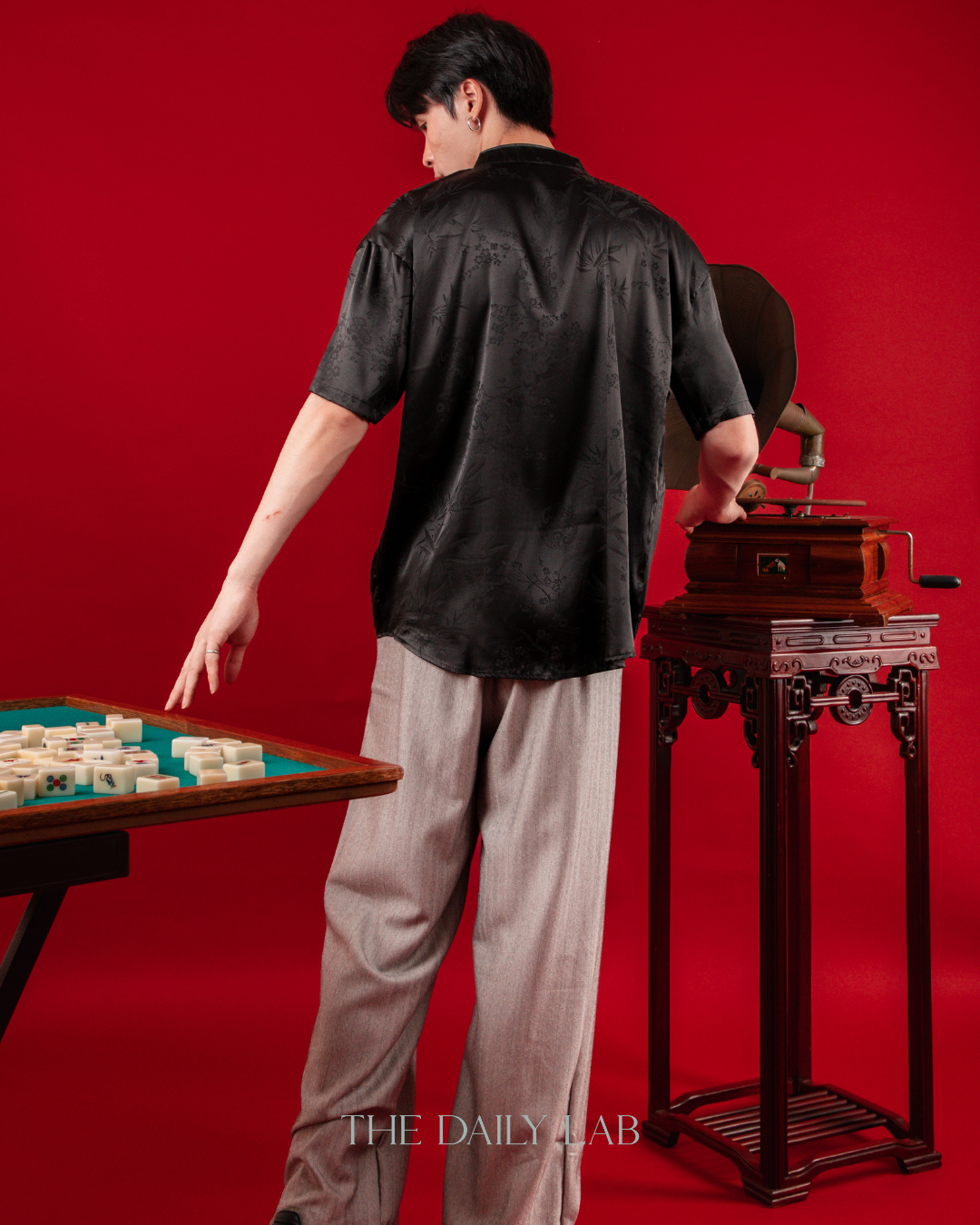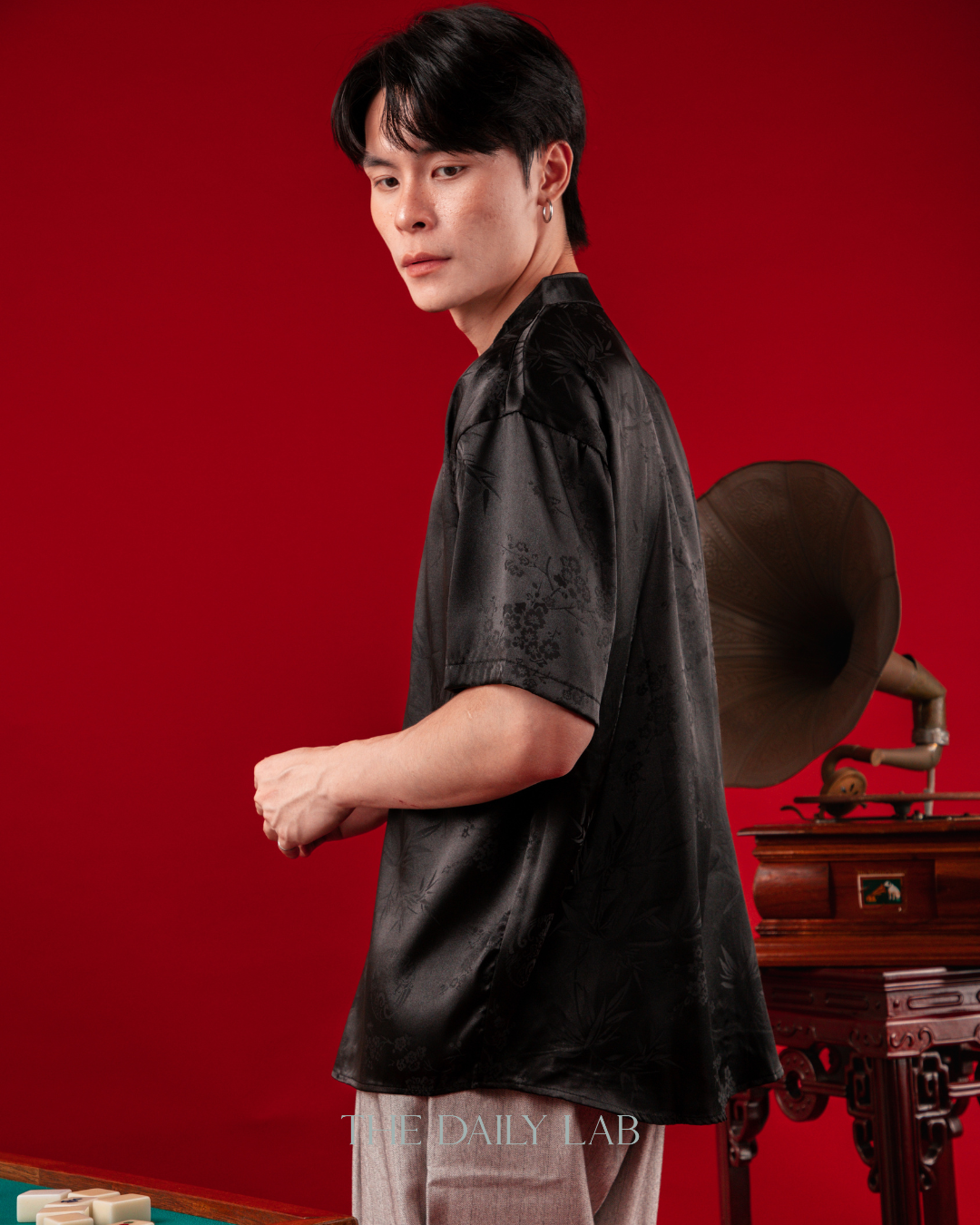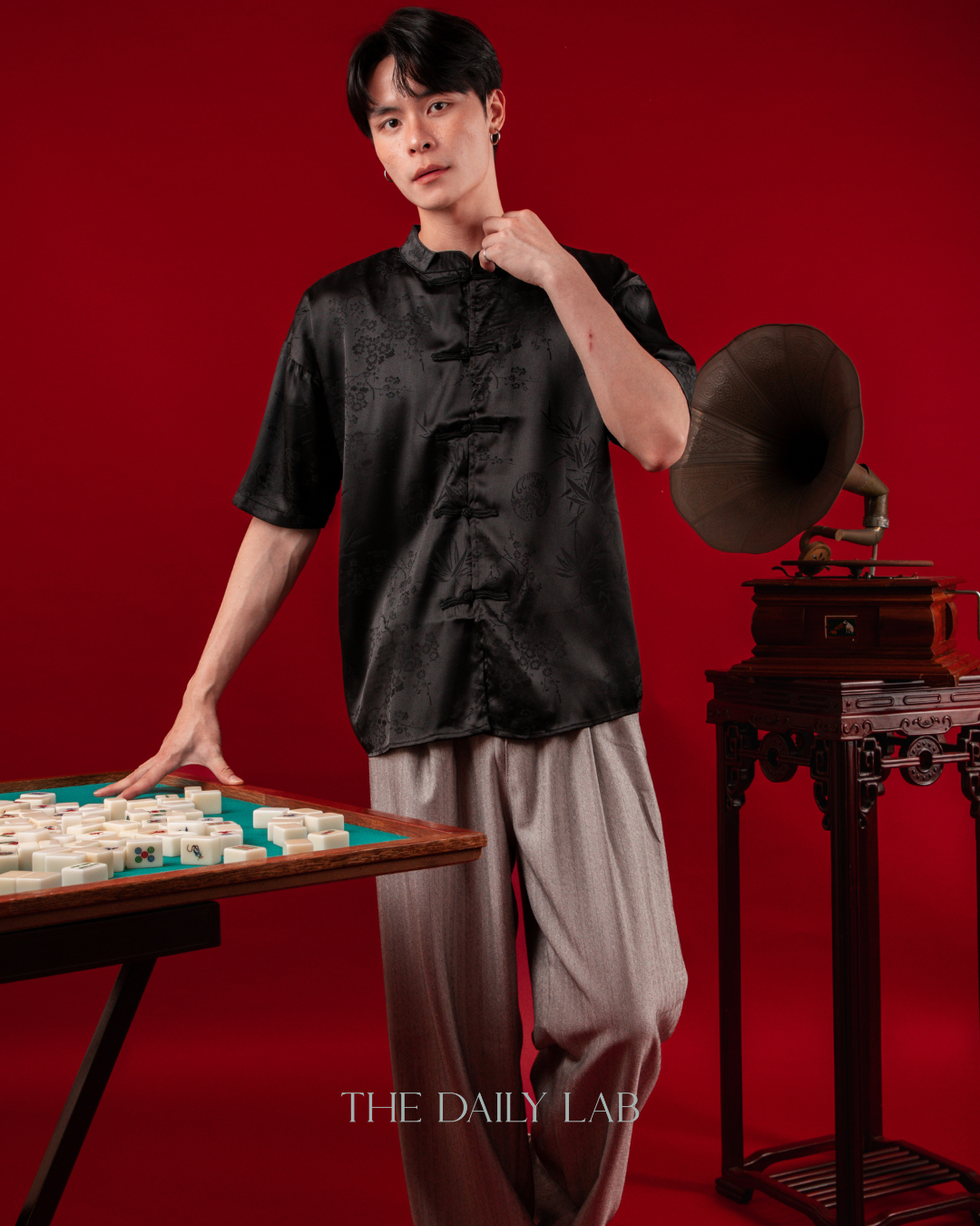 - Mandarin collar with traditional knot button closure