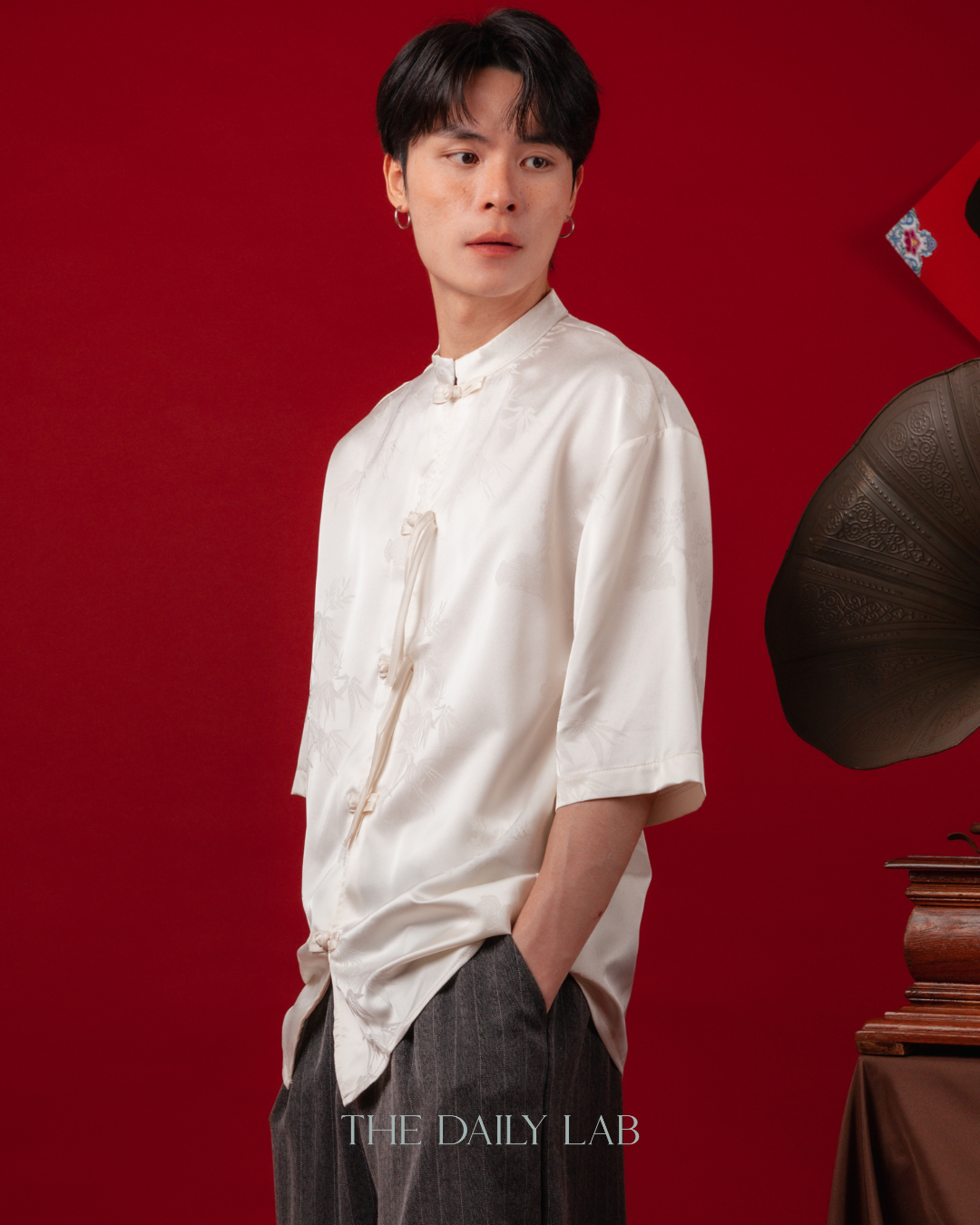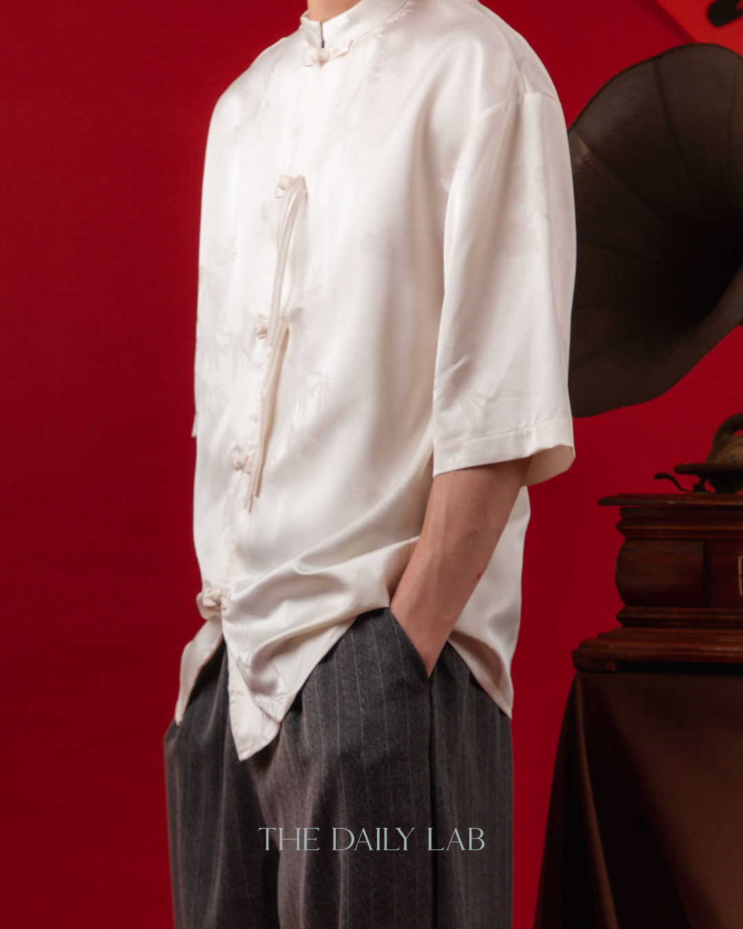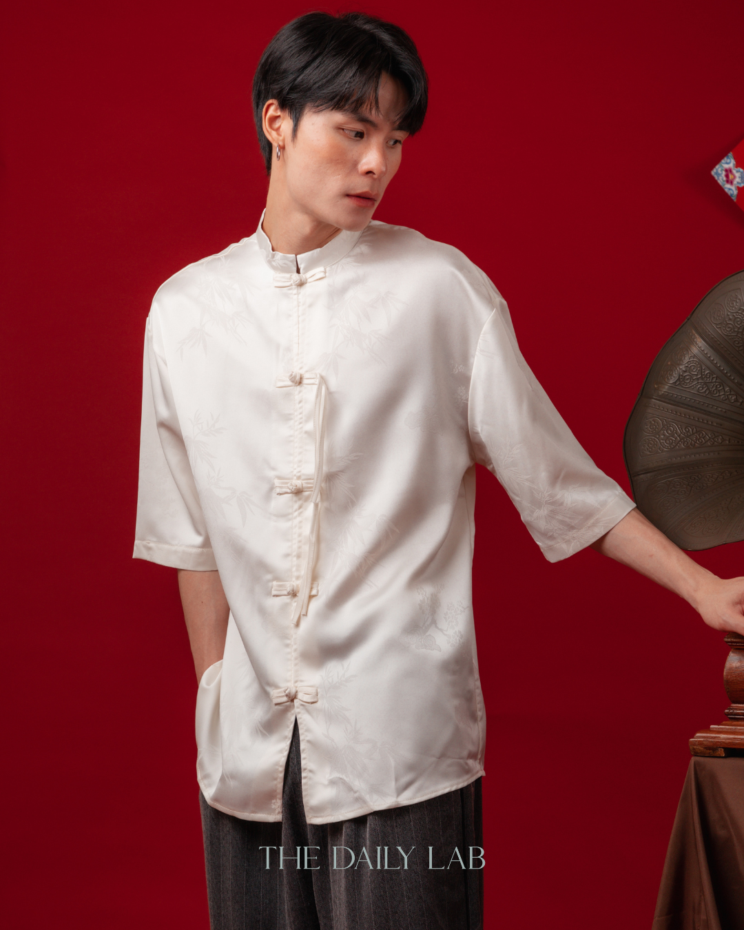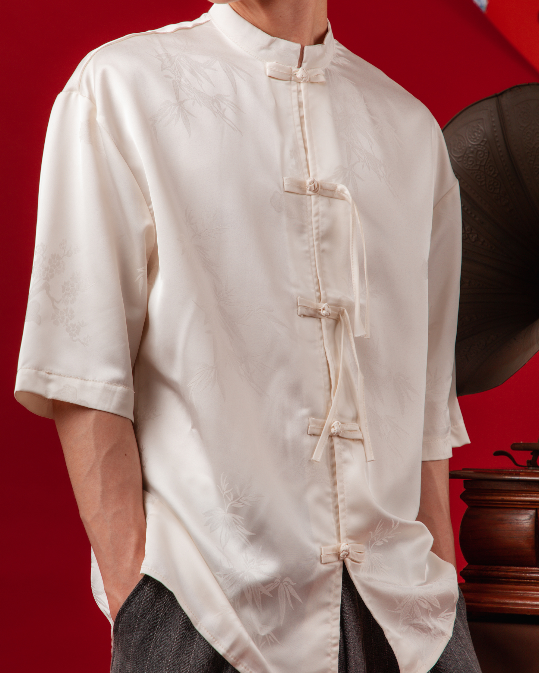 - Classic Tang-style knot buttons with a refined Mandarin collar